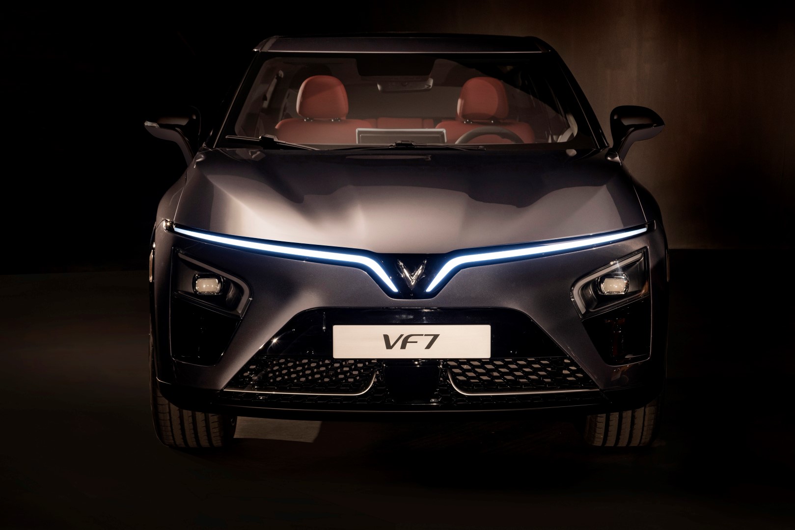 Đầu xe vẫn hiện diện dải đèn LED ban ngày tạo hình chữ V kích thước lớn, trải rộng sang 2 bên và có khả năng phát sáng ấn tượng. Vị trí trung tâm “mặt tiền” VF7 là niềm tự hào dân tộc với logo hình chữ V nhỏ, sáng bóng.